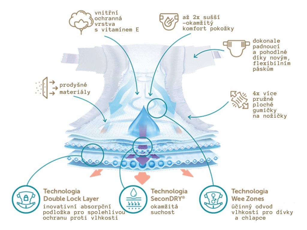 Jedinečný tvar absorpčních hadiček znamená, že vlhkost je rychle zadržována uvnitř pleny, což pomáhá udržet pokožku vašeho dítěte v suchu. Díky použité technologii je plenka tenčí, pružnější a ještě spolehlivější*.